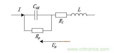 根據鋁電解電容的物理結構,可以用圖 1中所示的電路等效,其中CAK代表兩電極間的理想電容量;Rp是并聯電阻,代表了電容的漏電流成分;Rl代表了電容引出端及電極部分的串聯電阻成分;L代表了引出線和連接處的等效串聯電感成分。