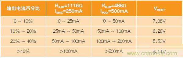 該器件系列具有動態整流器控制功能以改善負載瞬態特性(表2)。Qi標準有一個相對緩慢的全局反饋回路,最多可能需要100ms的時間來改變工作點。這意味著負載階躍會降低輸出電壓并引起系統復位。為了提供足夠的電壓應對瞬態變化,在低負載時需要把VRECT工作點設高。該特性有助于負載階躍,但會降低輕載效率。為解決這個問題,用動態效率調節功能來調節輕載電壓,以適應最大輸出負載。此外,還用一個電阻器來設定最大輸出電流。