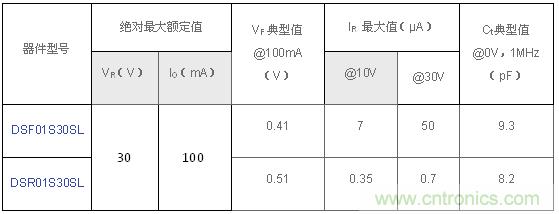 圖4:東芝肖特基二極管DSF01S30SL和DSR01S30SL的主要規格
