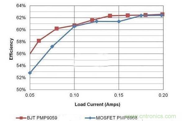 在低功耗(3W 及以下)反激式電源中,很難在成本上擊敗 BJT。大批量購買時,一個 13003 NPN 晶體管價格可低至 0.03 美元。該器件不僅可處理 700V VCE,而且無需過大的基流便可驅動幾百毫安的電流。使用 BJT,增益和功率耗散可能會將實際使用限制在低功耗應用中。在這些低功耗標準下,MOSFET 與 BJT 之間的效率差異非常細微。下圖 1 對比了兩個相似 5V/1W 設計的效率。第一個設計是“230VAC 輸入、5.5V/250mA 非隔離式反激轉換器”使用 MOSFET,而另一個設計則是“120VAC 輸入、5V/200mA 反激轉換器”使用 BJT。這并不是完全公平的對比,因為這兩個電源在設計上采用不同的輸入電壓運行,但它說明了它們的效率有多相似。