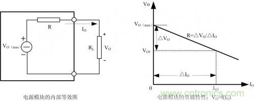 圖 1為電源模塊的內部等效與輸出負載特性曲線:VO=f(IO),R為模塊的輸出阻抗(包含導線電阻和接觸電阻等),空載時,模塊輸出電壓為最大值VO(max)。當負載電流變化△IO時,負載電壓變化量為△VO,△VO=R*△IO,R*△IO也表示模塊的負載調整率。負載電壓VO與負載電流IO的關系可表示為:
