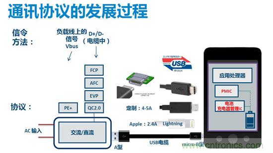從事電源設計開發和技術支持工作超過24年的Jason分析道,從線型降壓電源開始,電源開發在摸索中前進,體積越做越小,充電方式也迎來了新的變革,現在的趨勢是快速充電。以前的充電器只提供一個固定的輸出電壓(5V),電源提供的輸出功率取決于輸出電流的大小,輸出電流越大則提供給電池端的功率更大,從而提高充電效率減小充電時間。但電流不能無限制的增加,因在輸出電纜的功耗隨電流的增大會相應的增加。因而快速充電應用應運而生。其實現方法是手機跟充電器進行雙向通訊,電源會根據負載端發出的指令做出反應,改變其輸出電壓和電流,實現減小功率損耗、增大充電功率、減小充電時間的目的,從而實現快速充電。