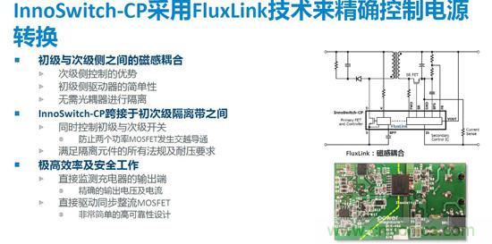 此次最新發布的InnoSwitch-CP采用Fluxlink技術來精確控制電源輸出特性,是典型的次級側控制方式的電源方案。IC內部初次級側各有一個控制器,初級側還集成了一個功率MOSFET,,次級側控制器實現對輸出電壓和電流的監測,根據監測結果將信息反饋至初級,進行相應的開關控制,從而實現更精確的輸出電壓和電流的控制。此外InnoSwitch-CP配置了次級側的同步整流驅動技術,可以大大提升電源效率,改善充電器溫升。采用次級側控制器同時控制初級和次級兩個開關管的開關,可以防止某些情況下可能出現的兩個開關管同時開通的現象,從而避免災難性的故障發生。相對于其它采用兩個控制器分別控制初級和次級MOSFET的方案,InnoSwitch-CP可以實現更加可靠的同步整流工作控制,任何情況下都不會出現初級和次級兩個開關同時導通的情況,從而大大提高可靠性。