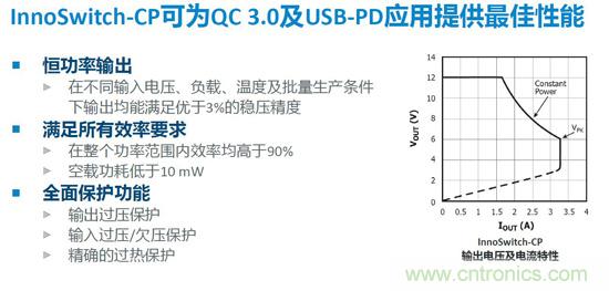 不管提高電流還是電壓,最終目的都是提高輸出功率,PI全新產品InnoSwitch-CP系列實現18w恒功率輸出,降低線路上的損耗,改善手機發熱,實現真正快速充電。