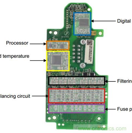因為兩種均衡功能各有利弊,本來主動均衡功能是可以替代被動均衡功能的,但因為結(jié)構(gòu)復(fù)雜成本高,而且結(jié)構(gòu)復(fù)雜之后故障率也會高而與被動均衡處于膠著狀態(tài),業(yè)內(nèi)人士常為了哪種均衡更好爭論不休。特斯拉的BMS均衡功能(被動均衡,見下圖中Cellbalancingcircuit中所指均為放電電阻)經(jīng)常被示范以證明被動均衡強(qiáng)于主動均衡。其實這反而證明了任何技術(shù)選擇都要和整體條件適用的道理。