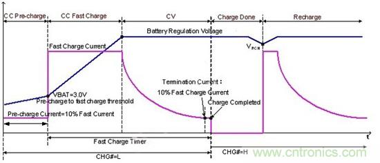 先來了解下鋰電池手機完整充電的三個階段:恒流預充電、大電流恒流充電和恒壓充電。手機電量耗光之后電壓降低,當低于一定數值時充電器會使用比較低的電流對鋰電池進行預充電。經過一段時間,鋰電池電壓高于預定數值后,就進入第二個階段大電流恒流充電,此時適當提高電流可以加快充電速度,具體過程可以參考下圖。