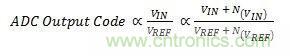 這個影響與ADC的基本任務相關;而ADC的基本任務就是提供一個輸出代碼,來表示輸入信號電壓與基準電壓的比率。輸入和基準電壓都會將一個噪聲項添加到這個比率中,如方程式1所示: