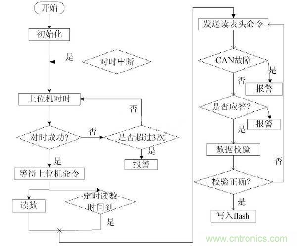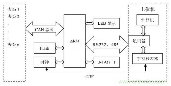 集中器通過CAN控制器發送讀表命令信號到總線上,每個表頭根據讀表命令將采集的信號通過CAN總線發送到集中器。集中器將采集的信號存儲在flash芯片中。上位機通過串口發送讀數據信號到集中器,集中器就把存儲在flash中的數據傳送給上位機。