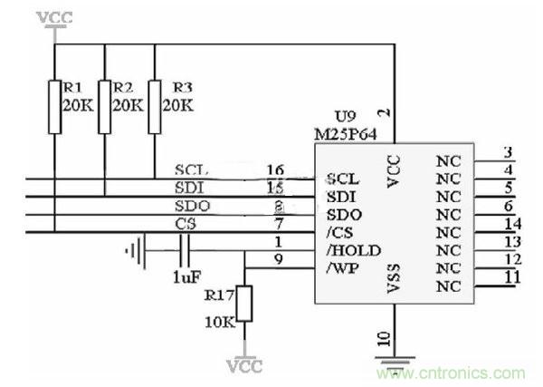 圖3為ARM與Flash的連接電路圖。以下幾點說明:(1)SCL串行時鐘信號,由主設備產生;(2)SDO主設備數據輸出,從設備數據輸入;(3)SDI主設備數據輸入,從設備數據輸出;(4)CS為片選,從設備使能信號,由主設備控制。(5)對7、15、16角外接上拉電阻,提高芯片輸入信號的噪聲容限增強抗干擾能力。
