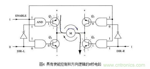 采用以上方法,電機的運轉(zhuǎn)就只需要用三個信號控制:兩個方向信號和一個使能信號。如果DIR-L信號為0,DIR-R信號為1,并且使能信號是1,那么三極管Q1和Q4導(dǎo)通,電流從左至右流經(jīng)電機(如圖5所示);如果DIR-L信號變?yōu)?,而DIR-R信號變?yōu)?,那么Q2和Q3將導(dǎo)通,電流則反向流過電機。