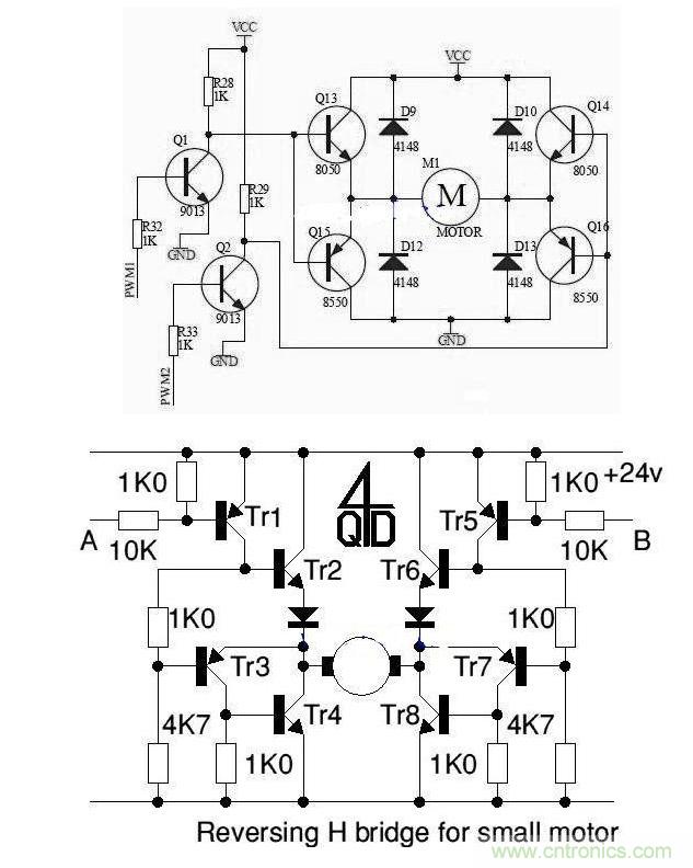 附兩張分立元件的H橋驅(qū)動電路:
