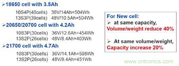 采用20700 /21700 /20650后,由于同等能量下,電池?cái)?shù)量減少(以21700為例,減少1 /3),這會(huì)帶來整個(gè)Pack內(nèi)部金屬連接件數(shù)量的減少,這會(huì)進(jìn)一步降低電池Pack的質(zhì)量。