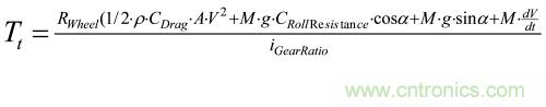 根據受力分析,我們可以推導出電動汽車行駛驅動力公式、驅動阻力公式、摩擦阻力公式、坡道阻力公式和加速阻力公式,進而可得到電動汽車的動態運動微分方程: