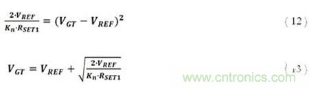 必須注意的是,這里可以很大程度上忽略通道寬度調(diào)制的影響。這是因?yàn)槿魏我蚵O電壓上升導(dǎo)致的漏極電流的上升會(huì)在通過(guò)RSET電阻后下降,并導(dǎo)致源電壓的上升。為了使MOSFET能維持任何電流,柵極電壓必須大于源電壓與閾值電壓的和。也就是說(shuō),給定一個(gè)柵極電壓,源電壓將被限制在至少比柵極電壓小一個(gè)閾值電壓的值,且再大的漏極電壓上升也不會(huì)提升漏極電流。因此,構(gòu)建相應(yīng)運(yùn)行條件,RSET必須足夠大,從而確保在上述限制下可允許作出以下假設(shè):