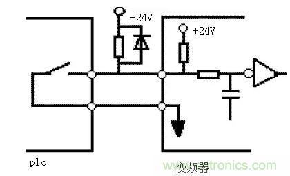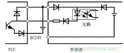 當輸入開關信號進入變頻器時,有時會發生外部電源和變頻器控制電源(DC24V)之間的串擾。正確的連接是利用PLC電源,將外部晶體管的集電極經過二極管接到PLC。如圖4所示。