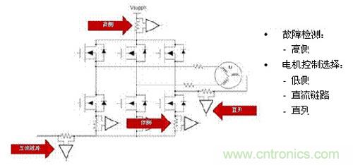 晶體管IGBT也很常見)來驅(qū)動直流電動機。該圖還包括高側(cè)電流感應(yīng),其通常在顯著錯誤情況下使用,比如接地電路短路的情況。