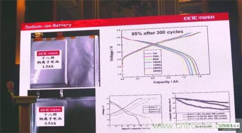 我們做了1.5Ah和0.5Ah兩種軟包全電池,正極材料采用前面提到的鎳錳氧化物,負極采用生物質的硬碳材料,經300次循環后容量衰降為15%。由此可見,鈉離子電池用廉價材料是可以制備的,而且電性能良好。