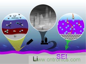 金屬鋰負極應用繞不開的是鋰枝晶的問題,早期人們對于鋰枝晶的認識主要來自于其他金屬電解過程中枝晶產生機理,對于鋰電池內鋰枝晶形成機理更多是“猜測”。而在2014年,美國橡樹嶺國家實驗室的Robert L. Sacci等「2」利用原位透射電鏡技術直接在玻璃碳表面觀測到了鋰枝晶的形成過程,從下面的動畫可以看到,不同于傳統的枝晶的概念,鋰枝晶首先以球形出現的,其表面擁有一些納米球,這些納米球具有一定角度的小面,隨后的在一次鋰顆粒的表面進行的二次結晶生長,會產生許多其他形狀的鋰晶體,如球形、多面體和針狀等。