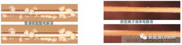 日本三重大學的Hui Wang等「3」開發了低濃度離子液體電解液,主要由溶解四甘醇二甲醚(G4或者G10H22O5),鋰鹽LiFSI,添加劑1,3-二氧戊環(DOL)組成,該電解液能夠有效的抑制鋰枝晶產生,在負極表面產生光滑的Li鍍層,提高金屬鋰負極的庫倫效率。鍍鋰后效果如下圖所示,從圖上可以看到采用新型電解液的銅電極表面鋰鍍層均勻分布(右圖),而采用傳統的碳酸酯類電解液的銅電極表面出現了大量的鋰枝晶(左圖)。