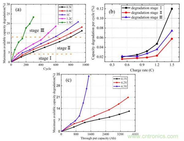 鋰離子電池的放電制度很大程度上依賴于使用者,好的放電制度對于有的使用者而言并不一定適用。但是充電制度則主要是設(shè)計者進行控制,因此對于充電制度對電池壽命衰降的影響的研究,能夠更好的指導我們對鋰離子電池的設(shè)計。北京交通大學的YangGao等針對不同的充電制度對鋰離子電池壽命衰降的影響,并研究了其作用機理,提出了鋰離子電池的壽命衰降模型。YangGao的研究顯示,當充電電流和截止電壓超過一定的數(shù)值時,鋰離子電池的衰降將被極大的加速,為了降低鋰離子電池的衰降速率,需要針對不同的體系,選擇合適的充放電電流和截止電壓。