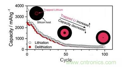 如此往復,惡性循環,導致每次的嵌鋰量逐漸降低。導致顆粒從核心向表層逐漸被鋰化,形成了“死鋰”(如圖2所示)。