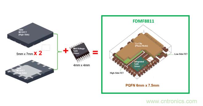 FDMF8811集成了一對100V的功率MOSFET、120 V驅(qū)動器IC和一個自舉二極管到6.0 mm x 7.5 mm 的PQFN封裝。