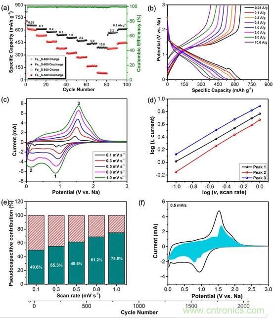 Fe1-xS納米材料的(a)倍率性能曲線;(b)相應(yīng)倍率下充放電曲線;(c)不同掃速下的CV曲線;(d)相應(yīng)氧化還原峰下的log i vs. log v曲線;(e)不同掃速下的贗電容貢獻(xiàn);(f)掃速為0.5 mV s-1時,CV曲線及相應(yīng)贗電容所占比例。