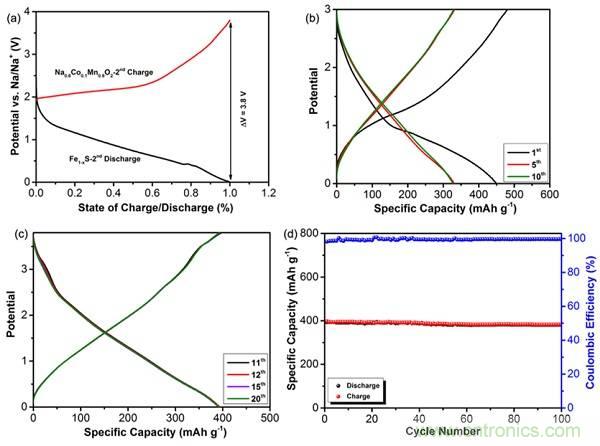 (a)Na0.6Co0.1Mn0.9O2正極和Fe1-xS負(fù)極充放電曲線對比;Na0.6Co0.1Mn0.9O2/Fe1-xS全電池在電流密度20 mA g-1時的電化學(xué)性能(b,c)充放電曲線;(d)循環(huán)穩(wěn)定性曲線。
