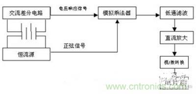 為了解決上述各方法的缺陷,本文采用了四端子測量方式,將蓄電池兩端上的電壓響應信號通過交流差分電路與產生恒定交流源的正弦信號經過模擬乘法器相乘,再將模擬乘法器的輸出電壓信號通過濾波電路,使交流信號轉變為直流信號,直流信號經直流放大器放大后進行模數轉換,將轉換后的值送入單片機進行簡單處理。