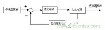 電路組成框圖如圖2所示:這是一個閉環控制系統,電流負反饋電路。標準正弦波產生一個頻率穩定、對稱、失真度低的1KHz正弦波信號。驅動電路把正弦波放大,去推動功放電路,得到正弦交流電流輸出。恒流控制電路從功放輸出中得到的信號,通過與給定的信號相比較,來調節驅動電路的信號,從而使輸出電流保持穩定。