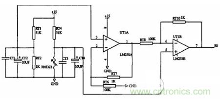 本系統是采用了熱敏電阻進行電池本身的溫度檢測。與電橋電路結合,將溫度信號反映為電壓信號。電路如圖3-4。