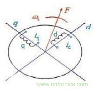 當(dāng)圖1和2的兩個(gè)旋轉(zhuǎn)磁動(dòng)勢(shì)大小和轉(zhuǎn)速都相等時(shí),即認(rèn)為圖2的兩相繞組與圖1的三相繞組等效。圖3兩個(gè)匝數(shù)相等且互相垂直的繞組d 和q,其中分別通以直流電流id和iq,產(chǎn)生合成磁動(dòng)勢(shì)F,其位置相對(duì)于繞組來(lái)說(shuō)是固定的。如果讓包含兩個(gè)繞組在內(nèi)的整個(gè)鐵心以同步 轉(zhuǎn)速旋轉(zhuǎn),則磁動(dòng)勢(shì)F自然也隨之旋轉(zhuǎn)起來(lái),成為旋轉(zhuǎn)磁動(dòng)勢(shì)。把這個(gè)旋轉(zhuǎn)磁動(dòng)勢(shì)的大小和轉(zhuǎn)速也控制成與圖1 和圖2中的磁動(dòng)勢(shì)一樣,那么這套旋轉(zhuǎn)的直流繞組也就和前面兩套固定的交流繞組都等效了。