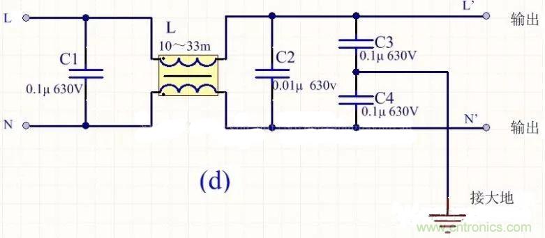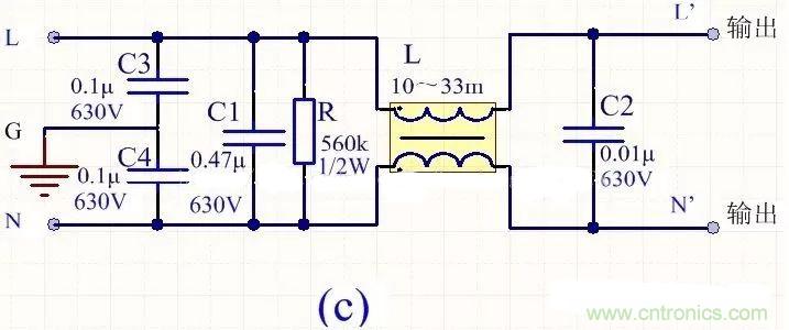 為降低成本和減小體積,開關(guān)電源一般采用簡易的EMI濾波器,主要包括共模扼流圈L和濾波電容,以下四種可以根據(jù)情況進行選擇: