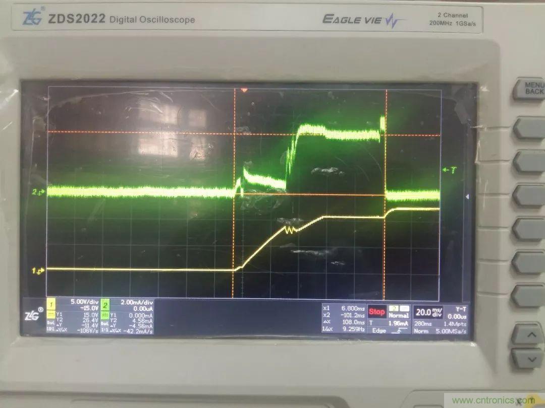 如下圖3所示,為圖2電路的實驗波形圖,綠色為IE電流波形,黃色為VDD電壓波形(示波器采用zlgZDS2022)。從圖中可看出開關電源啟動可分三個階段,第一階段,在上電時IE以近似1mA的電流向電容C充電,當VDD電壓達到UCC28C40門限電壓時進入第二階段,此時飽和電流增加至5mA,在為IC供電的同時繼續為電容充電,當輸出電壓建立后進入第三階段,此時IE電流為零,啟動電路停止工作,VDD電壓上升至輔助繞組電壓。在啟動的整個過程中,IE的電流都是比較小而且比較平緩,所以該電路安全可靠。