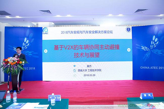 西南大學汽車電子專家冀杰博士在論壇上做了車規與基于V2X的車輛協同主動避撞技術展望的大會報告。