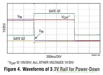 圖 4 示出了失去 3.3V 電壓軌時的波形。當輸入電壓下降時,Q2 的柵極電壓保持不變 (接近于地電位),而且 Q2 處于關斷狀態。與此相反,Q1 的柵極電壓則急劇上升至 3.3V。這把 Q1 關斷,由 Q1 的體二極管起隔離二極管的作用,從而使負載與輸入分離。此時備份電源接管供電,LTC3643 通過釋放存儲電容器的電能以給關鍵的負載提供3.3V。