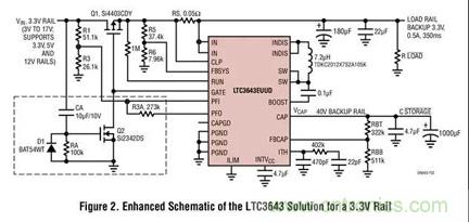 于是,就有了 LTC3643,它能使我們采用一種相對便宜的儲能元件——低成本電解電容器。本文將介紹的是一款電路,它使 LTC3643 用作針對 3.3V 電壓軌的備份電源解決方案。