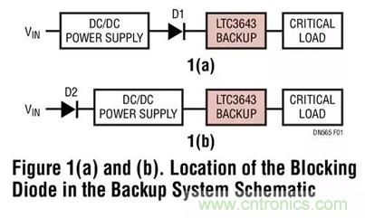 LTC3643 可容易地適用于 5V 和 12V 電壓軌的備份解決方案,但是 3.3V 電壓軌解決方案則需要格外謹慎。LTC3643 的最小工作電壓為 3V,比較接近于 3.3V 的標稱輸入電壓電平。如圖 1a 所示,當采用一個隔離二極管以使備份電壓電源與非關鍵的電路分離時,這種余量就太嚴緊了。如果 D1 是一個肖特基二極管,其正向壓降 (作為負載電流和溫度之函數) 會達到 0.4V 至 0.5V,足以把 LTC3643 VIN 引腳上的電壓置于 3V 最小值以下。因此,備份電源電路可能無法啟動。