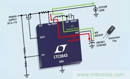 在這里提及的備份電源或保持電源中,當電源存在時,LTC3643 把存儲電容器充電至 40V,而當電源中斷時,LTC3643 則把該存儲電容器的電能釋放給關鍵的負載。負載 (輸出) 電壓可設置為介于 3V 和 17V 之間的任何電壓。