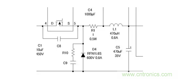 電感L1如電路圖所示,由輸出電容器C5和LC濾波器共同組成。L1電感值的設(shè)置要使設(shè)備在不連續(xù)模式下工作。這是因?yàn)槿绻赃B續(xù)模式工作,二極管的反向恢復(fù)時(shí)間、trr間的反向電流會(huì)導(dǎo)致二極管的損耗増加,而且該反向電流還會(huì)成為MOSFET導(dǎo)通時(shí)的峰值電流,因此MOSFET的損耗也會(huì)増加。為了避免這種問(wèn)題而選擇不連續(xù)模式。