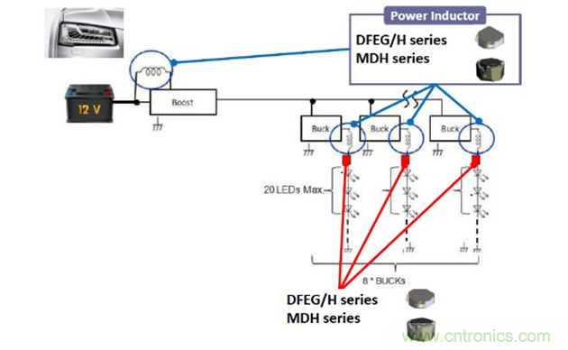 在汽車應用中,目前車燈廣泛采用LED光源,因此會用到Boost DC/DC和Buck DC/DC等轉換器。