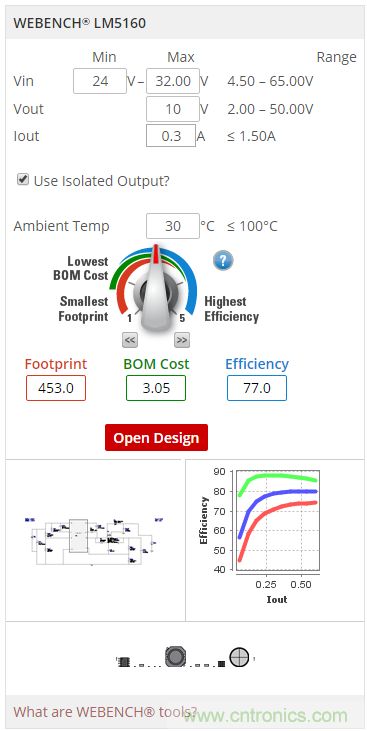 在WEBENCH可視化編輯器中提供了一個可行解決方案列表,使你能夠輕松地對使用不同器件和拓撲的設計進行分類,并在它們之間進行比較。一旦你發現有一個Fly-buck設計能最好地滿足你應用的需要,可單擊“Open Design”(打開設計)按鈕將其打開。