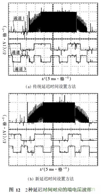 2種延遲時間設置方法對應的實測端電壓波形(通道1)如圖12所示,通道2和通道3為過零點檢測波形,通道2的上升沿和下降沿對應于過零點,而通道3的上升沿和下降沿分別對應過零點和換相點.