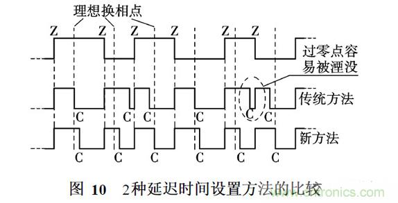 采用傳統的延遲時間設置方法,某些換相點偏離理想換相點較大. 當某次換相嚴重滯后時,下次過零點容易被湮沒,導致電機失步,如圖10所示.