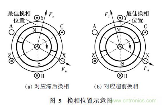 最佳換相邏輯是指繞組在梯形波反電勢的平頂部分導通, 與之對應的最佳換相位置是指在換相完成后,定子磁勢超前轉子磁勢120°電角度,如圖5所示. 其中, Fa 和Fr 分別表示定子磁勢和轉子磁勢. 在一個工作狀態內定子磁勢平均超前轉子磁勢90°電角度,平均電磁轉矩最大.