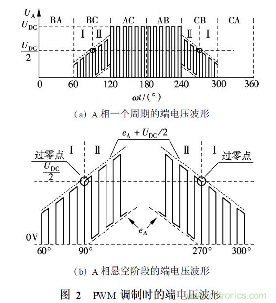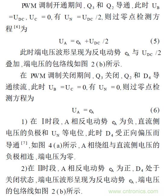 【導讀】分析了上橋臂PWM 調制、下橋臂恒通調制方式時的端電壓波形,討論相應的反電動勢過零點檢測方法。在PWM 調制信號開通狀態結束時刻對端電壓進行采樣,由軟件算法確定反電動勢過零點. 針對電機運行時存在超前換相或滯后換相的情況,通過設置合理的延遲時間來實現最佳換相。