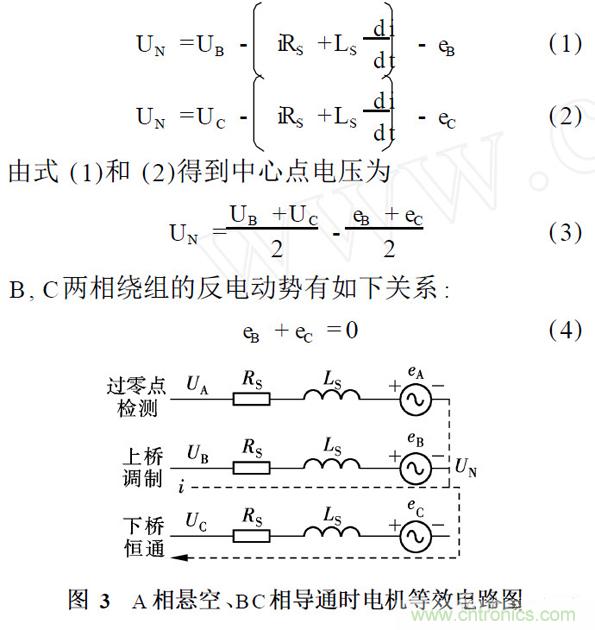 BC和CB 區為A 相懸空階段,將2個區域各自分為Ⅰ和Ⅱ兩個時段,如圖2 ( b)所示. 以BC 區為例,此時電流從B 相繞組流進, C 相繞組流出,如圖3所示. 圖中, RS 和LS 分別表示定子繞組的等效電阻和電感, UN 為電機中心點電壓, i為相電流. 忽略功率開關和二極管的正向導通壓降, 根據基爾霍夫電壓定律可得