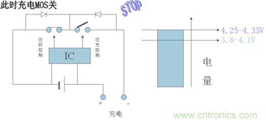 電池在被充電過程中,如果充電器電路失去控制,會使電池電壓超過4.2V后繼續(xù)恒流充電,此時電池電壓仍會繼續(xù)上升,當(dāng)電池電壓被充電至超過4.3V時,電池的化學(xué)副反應(yīng)將加劇,會導(dǎo)致電池?fù)p壞或出現(xiàn)安全問題。