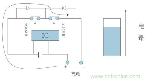在帶有保護(hù)電路的電池中,當(dāng)控制IC檢測到電池電壓達(dá)到4.28V(該值由控制IC決定,不同的IC有不同的值)時,其“CO”腳將由高電壓轉(zhuǎn)變?yōu)榱汶妷海筎1由導(dǎo)通轉(zhuǎn)為關(guān)斷,從而切斷了充電回路,使充電器無法再對電池進(jìn)行充電,起到過充電保護(hù)作用。而此時由于T1自帶的體二極管VD1的存在,電池可以通過該二極管對外部負(fù)載進(jìn)行放電。