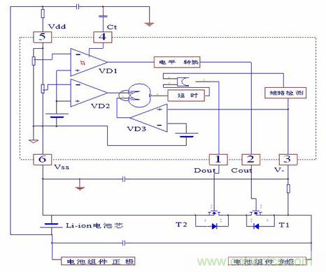 在控制IC檢測到電池電壓超過4.28V至發(fā)出關(guān)斷T1信號之間,還有一段延時時間,該延時時間的長短由C2決定,通常設(shè)為1秒左右,以避免因干擾而造成誤判斷。